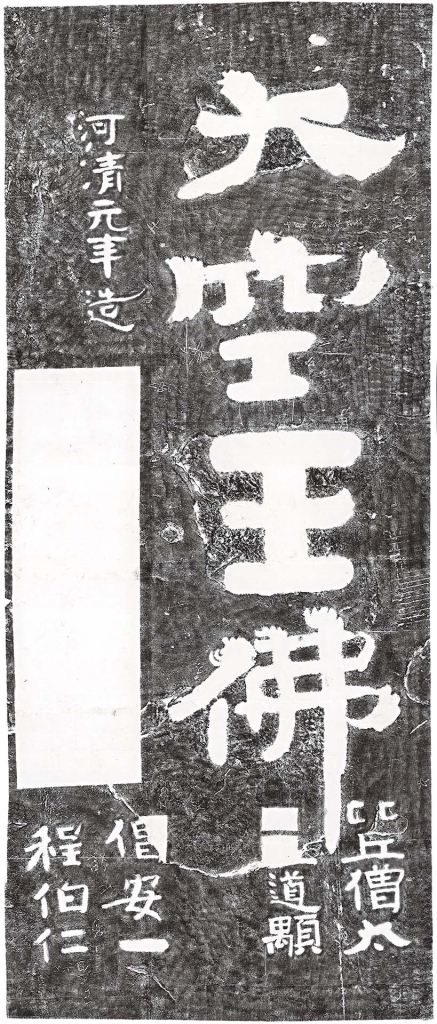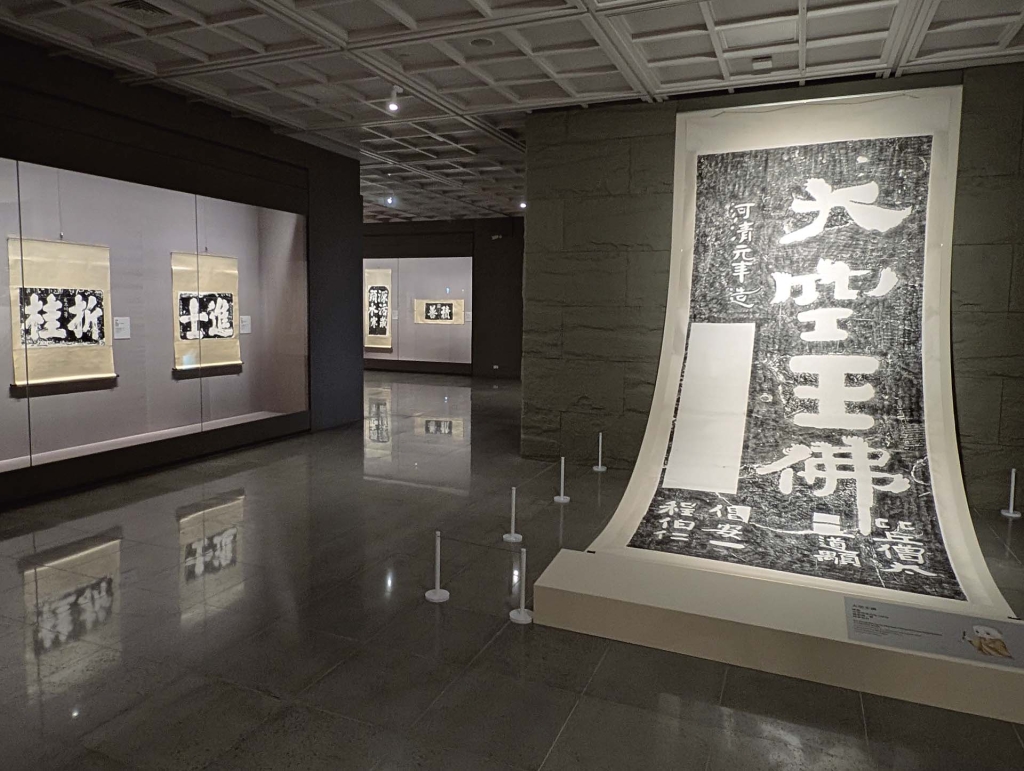 展廳入口,懸掛著高五公尺、寬二公尺的〈大空王佛〉拓片,尺寸宏大,結體寬博,讓人肅然起敬。「大空王佛」原石位於山東省濟南市平陰縣二鼓山,為北齊僧人安道一書刊,紀年「河清元年」(562)。北朝發生北魏太武帝、北周武帝二次重大滅佛事件,所謂「縑竹易銷,金石難滅」,為求佛法不滅,僧人大規模推動摩崖,令佛名、偈語、經文遍布山東泰山、嶧山一帶,本作即為其一。「大空王佛」是安道一最常題寫的佛名,據統計山東、河北就有14處,最大者達九公尺高、三公尺寬。特別的是,佛經中並無「大空王佛」這樣的稱號,其意義眾說紛紜,一說認為指釋迦牟尼的導師、過去佛「空王佛」,或說是一切佛的統稱。