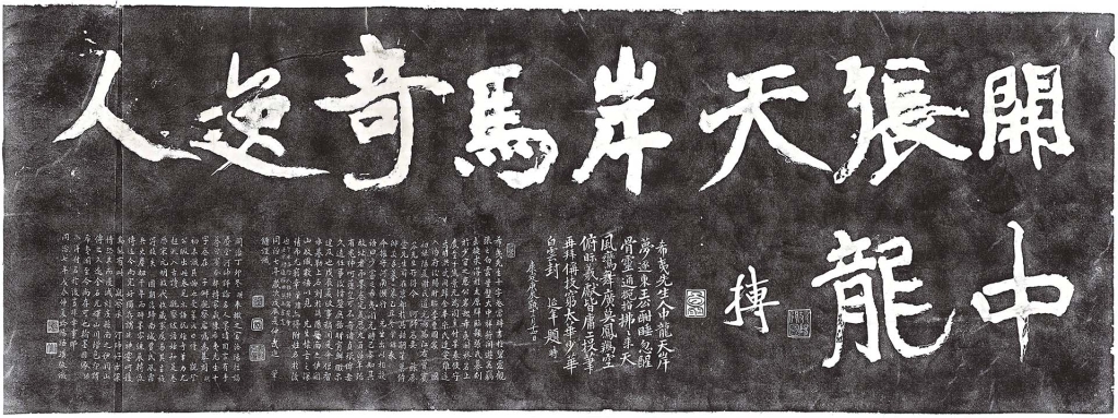 〈開張天岸馬,奇逸人中龍〉亦是名碑,別稱〈十字卷〉,原碑洛陽龍門石窟潛溪寺與賓陽洞之間的石龕,傳為五代宋初道人陳摶所書。陳摶精通易學和內丹,主張睡眠養生,傳說可長時間入眠,累月不起,有「睡仙」之稱,宋太宗賜號希夷先生。「開張天岸馬,奇逸人中龍」以天馬、人中龍自比,瀟灑自傲,頗具龍馬精神,受後世書畫家喜愛。聯句下有宋代石延年詩,略記陳摶生平:「希夷先生人中龍,天岸夢逐東王公,酣睡忽醒骨靈通,腕指忽忽來天風。鸞舞廣漠鳳翔空,俯視羲獻皆庸工,投筆再拜稱伎窮,太華少華白雲封。」其後則是清代陳肇鏞、路璜跋文,考述本卷流轉、上石的過程。