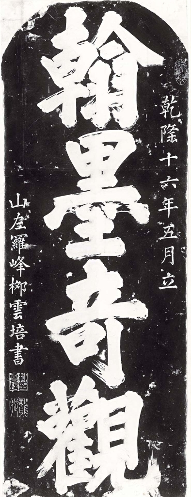 來自碑林的拓本,包括清代柳雲培榜書大字〈翰墨奇觀〉。「翰墨奇觀碑」碑陽為西安府碑洞石刻目錄,記錄乾隆時碑林收藏的重要碑石70種,由柳雲培父親柳大任編撰,是碑林最早的石刻碑目。碑上的跋文稱,柳大任之所以整理石刻目錄,是因為「庶覽法物可提其要辯砆碔者,亦共識好古之深心」。碑石兩面俱由年少的柳雲培書寫,《招遠縣志》有載:「柳雲培,號滋圃,邑諸生。官南城兵馬司吏目。書法最工,乾隆時楷行具呈御覽,御書不亢不卑以賜焉,書西安府碑洞翰墨奇觀碑,時年才十二。」