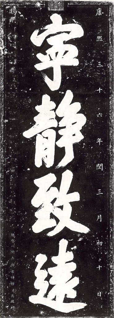 康熙皇帝御筆〈寧靜致遠〉也來自西安碑林,此句語句出自西漢《淮南子》:「非澹泊無以明德,非寧靜無以致遠」,諸葛亮〈誡子書〉曾引用此句。碑石正上方鈐有「康熙御筆之寶」篆印,左下署「賜總督川陝兵部右侍郎臣吳赫」,時間為「康熙三十六年閏三月初十日」。根據史料,此時康熙帝正第三次親征噶爾丹,於寧夏坐鎮指揮,閏三月己丑(初九日),康熙召見川陝總督吳赫及數名大臣,告誡他們當愛護兵丁,禁冒支軍餉,「凡有功而居官好者,朕皆擢用矣。其一時聲名甚佳,日久改節者,皆年齒漸增、貪貨賄,計身家,而坐此失也爾。」隔日,便親書「寧靜致遠」賜予吳赫,有期勉勸戒之意。