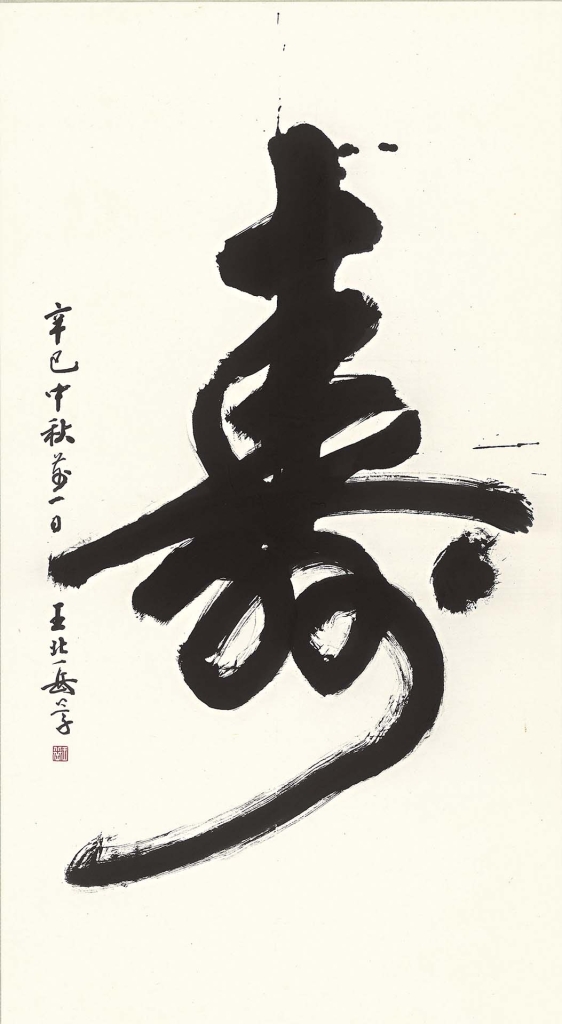 除了收錄古代作品,本次特別展出近代書家之作,補齊榜書的現代視野,展品如陳其銓2001年中台禪寺落成時,特別留下的墨蹟〈達觀〉。或如書法篆刻家王北岳,他畢生致力於刻印、著作、收藏印鉥,為臺灣篆刻教育重要推手,其書作以對聯、鏡片較多,本次展出草書大字〈壽〉,高逾1.3公尺,如此尺幅實屬少見。