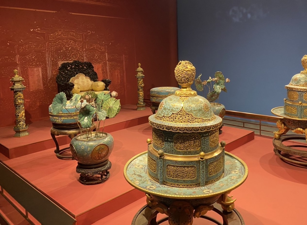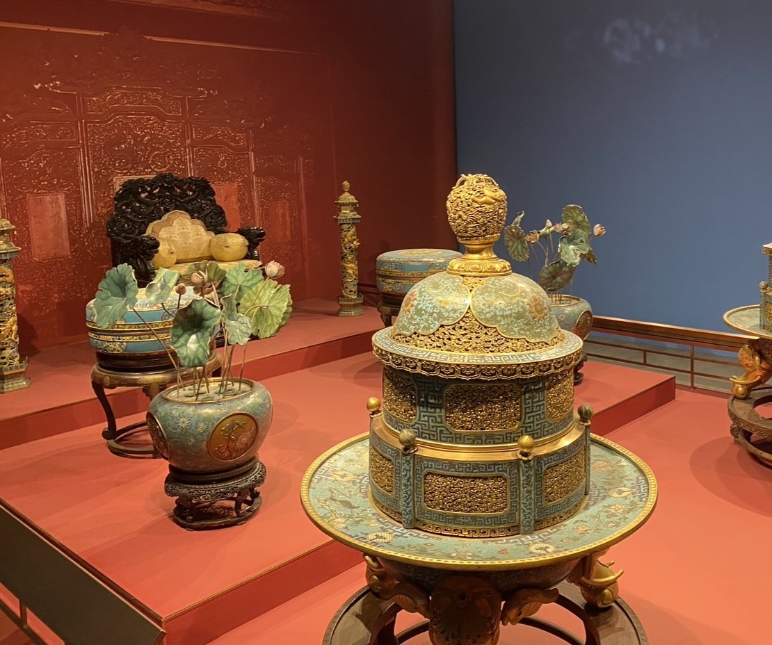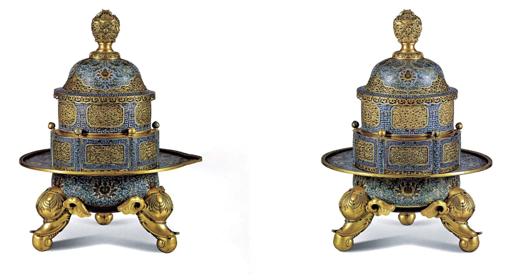 出身皇室貴族的掐絲琺瑯工藝,可上溯自元代,至晚明以景泰年間製作的掐絲琺瑯為尚,故得名「景泰藍」。景泰藍製作工藝困難,所費不貲,在清宮用途廣泛,包括生活用器、宮殿陳設(圖3)、文房用品、禮儀祭祀、佛堂用器等,涉及宮廷生活的方方面面。今日多數掐絲琺瑯器藏於兩岸的北京故宮、瀋陽故宮、臺北故宮,少數散見於其他博物館。19世紀英法聯軍入侵中國時,宮中大量精美的景泰藍流散至海外,直到了近代不少文物透過拍賣,從歐洲被購藏「回家」。