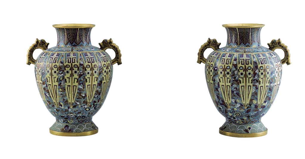 在拍賣市場上,器物類的文物經常會出現同款、雷同的作品,掐絲琺瑯器也不例外。在本次入藏上博的景泰藍中,就有兩組同款器,皆是張宗憲賣一捐一。兩組器物雖相似,但定年卻截然不同。