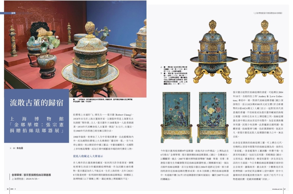 步入晚年的古董商兼收藏家,如同西方許多慈善家,慷慨地將畢生的部分珍藏捐贈給博物館,作為回饋社會的禮物。張宗憲認為作人不能忘本,生於上海的他,去年(2023)9月隆重地將一批明清時期的銅胎掐絲琺瑯精品,捐贈給上海博物館(以下簡稱上博),藉此補強上博館藏的不足。
