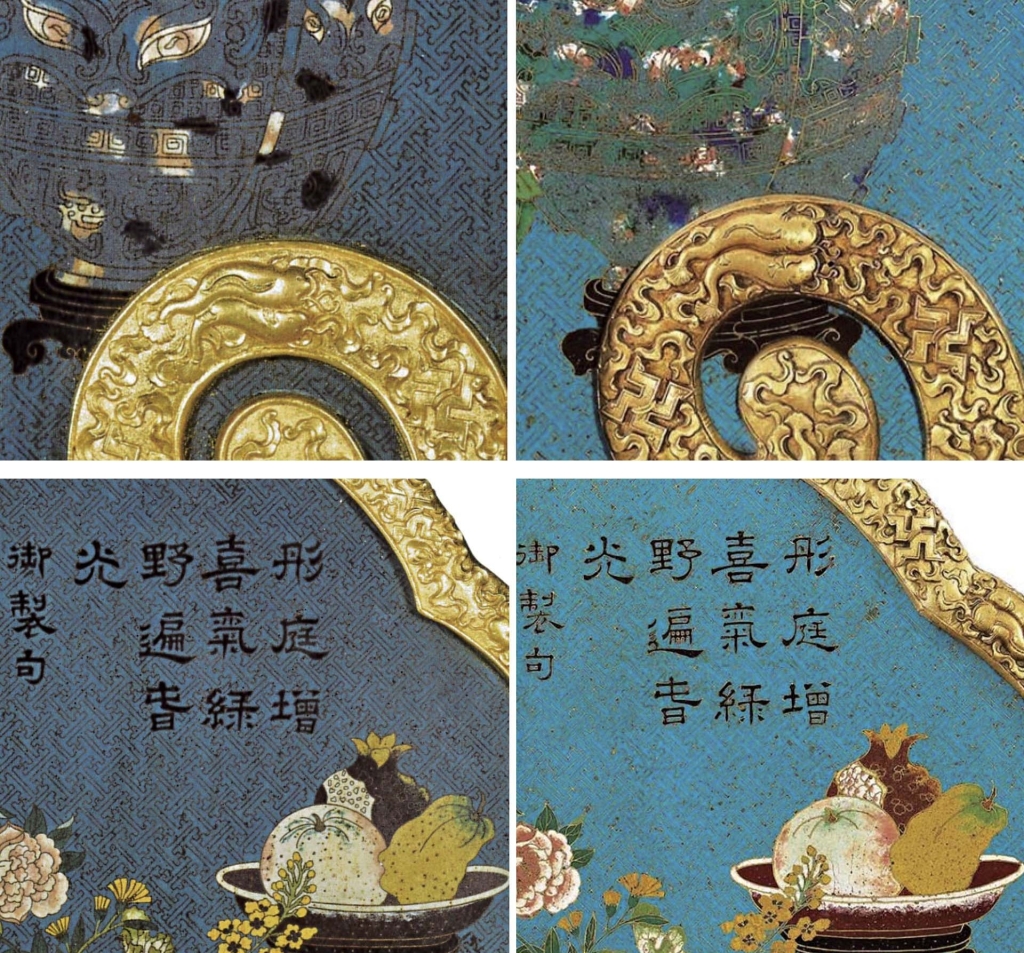 前後兩件掛屏,分別在蘇博及上博展出,由於定年差異,仔細比較兩者後,確實可以發現已售出的乾隆掛屏,品質明顯高於清代掛屏(圖9)。像是瓜果盤內的石榴,蘇博品的果肉粒粒飽滿分明;上博品則是簡筆勾勒。再說青銅壺的木座,蘇博品完整無缺;上博品則缺了右下一角。此外,蘇博品的金邊浮雕更立體、細節清晰,青銅壺用色也更豐富等等。
