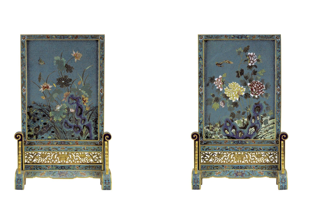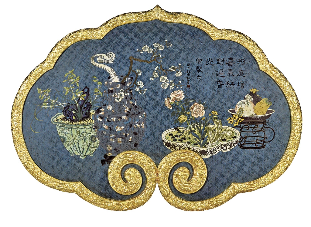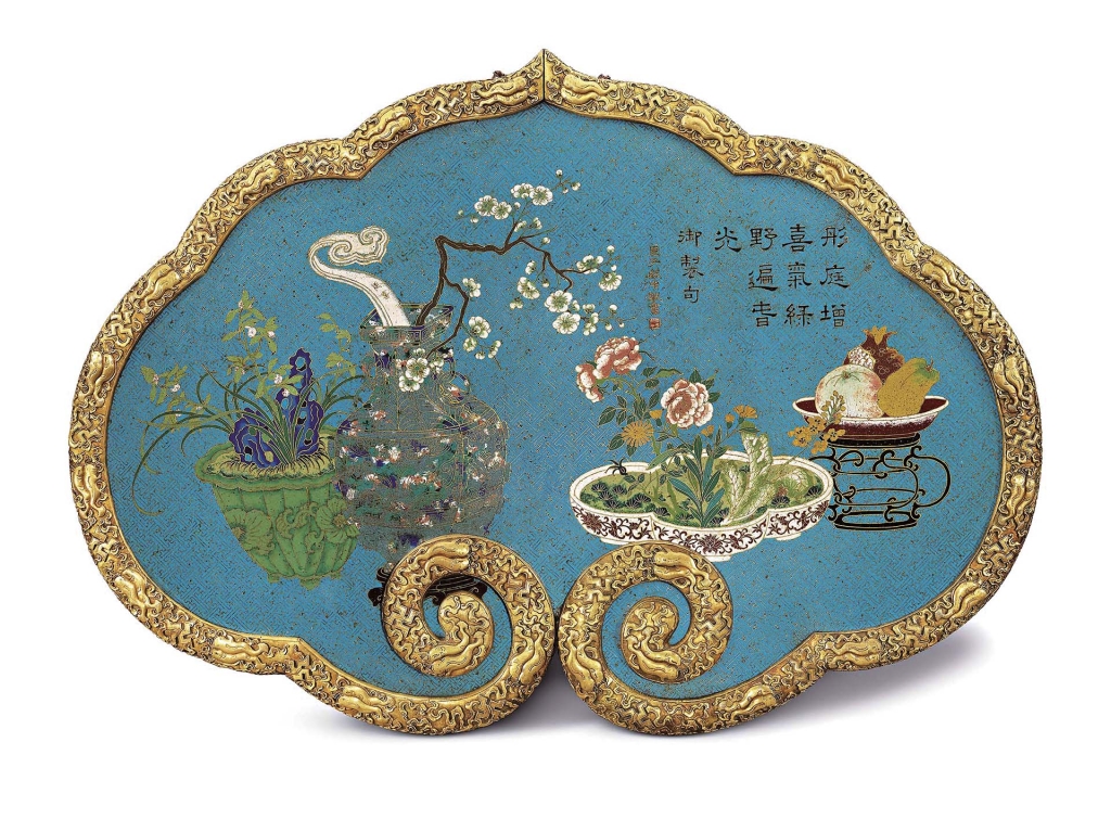 這件具「臣于敏中敬書」款的如意掛屏,如意形金邊浮雕萬字、雙魚紋,屏心以藍色琺瑯釉為地,掐絲「萬」字錦地上飾博古圖。屏心描繪盆景花卉、靈芝、石榴果盤,上方淺刻填黑御製詩「彤庭增喜氣,綠野遍春光」。原詩出自〈御製新正重華宮侍皇太后宴詩〉,祝福太后褔壽雙全,佳士得專家推測此作應為乾隆慶祝母后生日的賀禮。