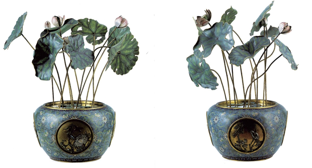 展中一對被定年為明嘉靖的〈掐絲琺瑯荷塘盆景〉(圖6),從過去的拍賣紀錄查詢發現,另一對雷同的荷花盆景,定年為清嘉慶年,並於2018年售出。清嘉慶年的這對荷花盆景,曾為蘇格蘭藏家舊藏,2011年11月張宗憲在倫敦佳士得以36萬1250英鎊成交價購入,並於2018年保利廈門春拍中以張宗憲舊藏的名義拍出人民幣667萬元的高價。兩組器物無論花盆顏色、作工樣式、開光紋樣等乍看十分相似,但從荷葉紋路、色澤,仍可分辨並非同一件。兩者斷代定年,落差遠超200年。