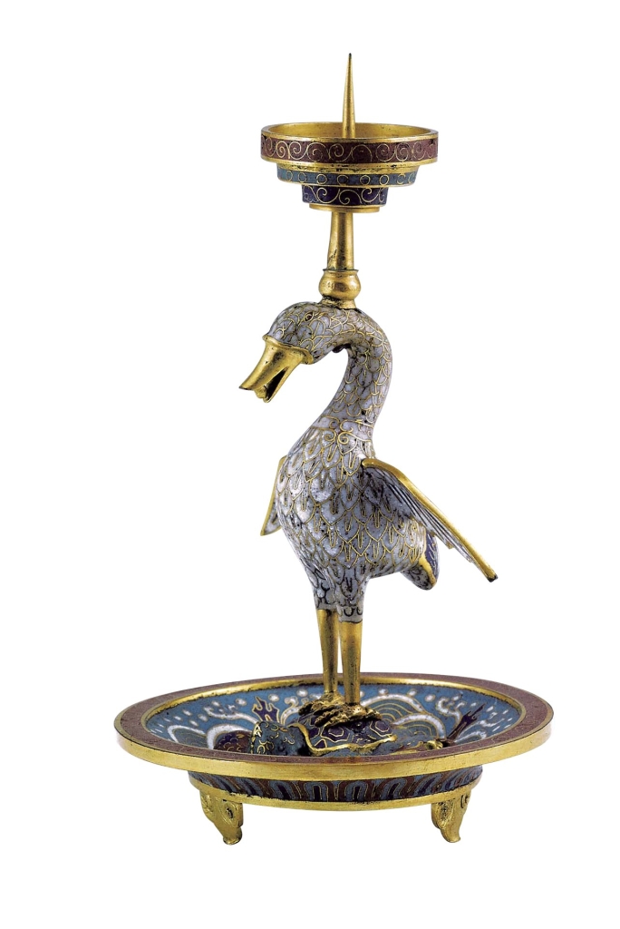 上博受贈的一件清乾隆〈掐絲琺瑯雁形燭臺〉(圖10),一隻振翅欲飛的白雁立於龜背上,雁頂有蠟錐可置蠟燭,寓意為「海宴河清」象徵天下太平,相同的燭臺可見於臺北故宮(中琺000444、故琺000445)。一件清乾隆〈掐絲琺瑯麒麟(獅子)香爐〉(圖11)腹部內空,背部有鏤空花形蓋,可做香薰用,類似的獅子陳設品在北京故宮(故00116345)和臺北故宮(中琺000348、000349)也有成對收藏,屬18世紀後期文物。