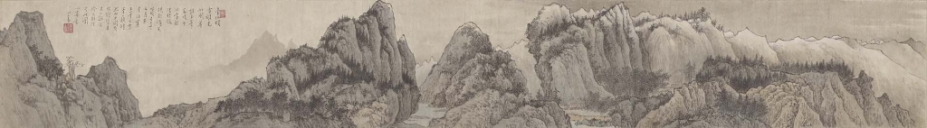 溥儒(字心畬)有一件臺灣知名景點之作〈玉峰雪景〉,畫上題記曰:「臺地暖,雪難見,如閩粵,惟玉峰高峻,冬必雪,然陰則凝,睍則消矣。戊戌(1958)季冬之月,茅舍沍寒,玉峰已雪,峰巔皚然,而平岡茂林猶碧,且其山谿深險不能往,寫此圖以寄意。」長卷開頭的遠山山頭白雪皚皚,顯見是畫題所言的玉山,隨著畫卷推進,近景山石慢慢浮現眼前。山脊處可見茂密的樹林,細看之下,則有小小的房舍隱於山間。前段看似傳統山水畫的散點透視,但在中景的蜿蜒河谷中,又隱約有著如同定點透視般的消失點,表現畫面的深度。畫卷的最後段,則是一座斜向盤踞的山脈,與遠景的山影形成虛實相應的空間。