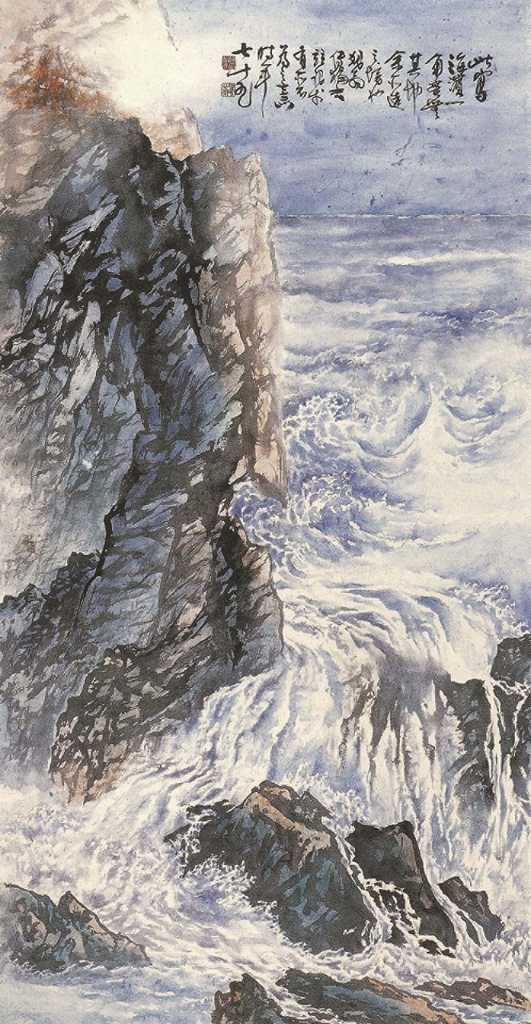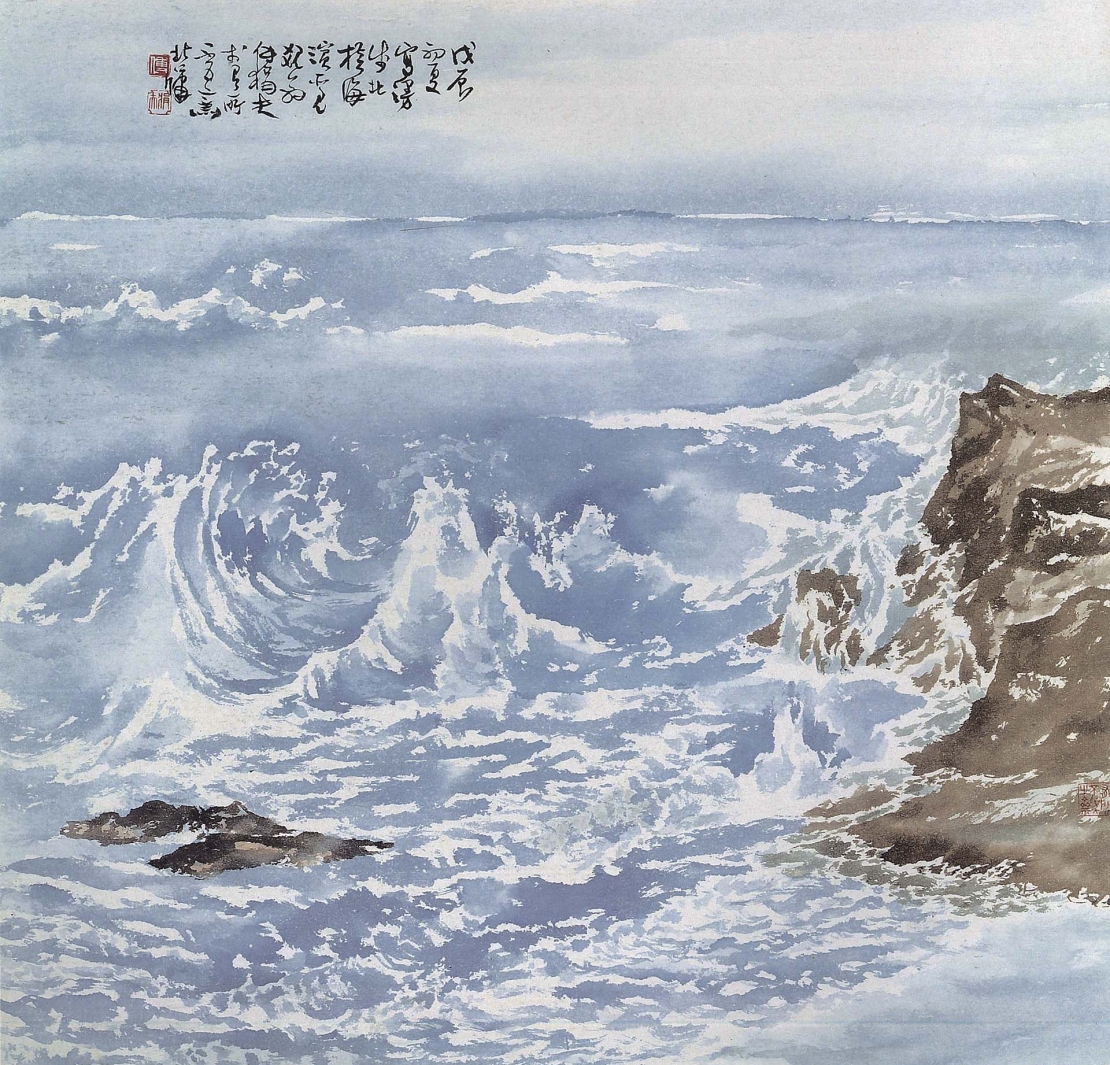 傅狷夫的〈海濤〉雖為斗方,畫家卻將海濤如實地呈現於畫面上。無論是海浪湧現的方向,亦或是藍白交織的浪色,都讓觀者宛如站在一片汪洋的面前。遠方的海天一線,更讓人感受到海洋遼闊無盡的魅力。傅狷夫更將自己對於臺灣山海景色的喜愛結合筆墨,自創了「裂罅皴」用以描繪山石肌理,「點漬法」用以表現海波洶湧,〈海濱一角〉便是傅狷夫用自創的筆墨寫胸中臆想的山水景色。畫面中無一是實景,卻又一不出於實景,已是畫家將眼目所及的寫生之道,自然而然地與心中丘壑融合。