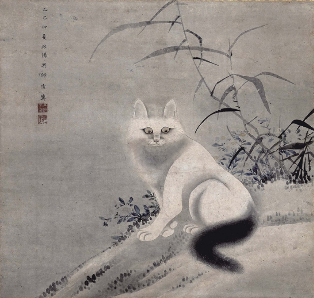 除了實體文物,繪畫的圖式與風格也暗示東亞區域內人物、文化的流通。那霸市歷史博物館藏〈神貓圖〉(圖10)為近世琉球繪畫名品,是該館的人氣藏品。〈神貓圖〉以淡墨襯出白貓,貓兒頭頸和尾巴的毛髮特別蓬鬆,牠眼神銳利,似發現了地上的小獵物。畫幅後方有蘆葦及淡彩的野菊相稱。畫家吳師虔(山口宗季),號雲谷,為琉球王府轄下貝摺奉行所的宮廷畫師,康熙四十二年(1703)奉命前往福州留學,師事花鳥畫畫家孫億(1638-1712?)及順梁亨等人,在中國待了四年,據說被傳授祕籍五卷。返國後,吳師虔被任命為首席繪師,負責繪製獻給大名的作品,以及國王的御後繪(琉球國王去世後所作肖像)。