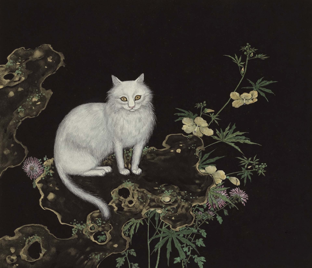 策展團隊從故宮典藏中擇選清代沈振麟〈菊葵貍奴〉(圖11)為對照,可發現二貓姿態相近,如水平鏡像,黃色眼眸、黑色眼線的特徵一致,口鼻線條也類似。畫家沈振麟於咸豐、同治年間(1851-1874)供奉內廷畫院,較吳師虔年代晚。故宮書畫文獻處助理研究員鄭淑方指出,二圖的相似不代表直接的模仿關係,或許意味當時有一共通的貓咪圖式流傳於東亞各地。