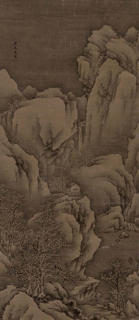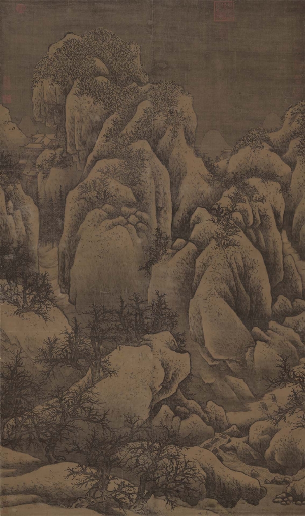 吳師虔的學生殷元良(座間味庸昌,1718-1767),同樣任職於貝摺奉行所,1752至1754年跟隨進貢使團赴中,由福州行至北京。其〈山水圖〉(圖12)表現崇山雪景,值得注意的是,此圖堅硬銳利的雪山、凹陷處的苔點、寒林、瀑布,似明清對范寬風格的定型化表現。故宮院藏傳稱范寬的〈雪山蕭寺圖〉(圖13)風格與之相似,圖中雪峰挺立,密林遍布,皴法和樹法有概念化的傾向,學者懷疑此作可能出自明人,體現的是明清對范寬風格的理解。審視殷元良的經歷,他對此種「范寬」的認識有幾種可能來源:一是在中國遊歷所見,二是中國畫譜,又或許在王府任職讓他得以見到中國書畫。看似簡單的畫作對比,背後反映中琉藝術互動,涉及各式途徑、層次與交換議題,絕非「向中國學習」一語可籠統概括。
