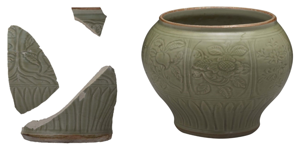 本次展覽,故宮向沖繩各單位借展之餘,亦積極締造院藏文物與借展品的對話,有許多「對照組」可玩味。以流通於國際的瓷器為例,在首里城遺址出土各式瓷器,包含青花、五彩、青瓷、景德鎮、德化窯,甚至荷蘭陶器。其中,首里城東暸望臺出土的〈龍泉窯青瓷劃花罐〉(圖8),便可和故宮院藏〈龍泉窯青瓷拱花折枝花果罐〉(圖9)相參照。陶瓷是明初給予琉球的賞賚品之一,首里城出土的大量龍泉窯可能由此而來。首里城內還曾發現一個較為完整的青瓷蓋罐,器身有「清香美酒」文字,推測這類器皿在琉球被用於盛酒。