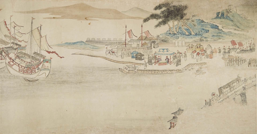 朱鶴年的〈奉使琉球圖〉(圖2)描繪冊封使團出使到歸國的20幀場景,首幅為使團從福州登船(清代實施海禁期間,福州是對琉球開放的唯一口岸),行前經羅星取水、諭祭海神、閩安觀兵等準備,之後從閩江口五虎門出海,午夜過溝、順風千里、姑米牽舟、候風十日、履險如夷、姑米開帆,終抵琉球,在琉球進行了冊封宣詔、重陽競渡、事竣登舟等活動。最後四幅描繪返程的山島避風、大霧停舟、返棹進口、舟抵福州。全卷場景刻畫詳實,對航行過程的驚險多所著墨。本卷並未載明所繪年份,不過若干情景可為線索,如「姑米牽舟」畫使船抵達琉球近海的久米島,因無風而需以數艘小船牽引,這個情節與《琉球國志略》記載相符。《琉球國志略》為乾隆間冊封副使周煌所寫的使琉紀錄,可推知本卷主題是乾隆二十一年(1756)冊封世子尚穆的經過。