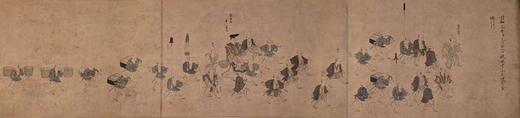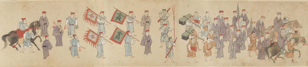 兩屬時期,琉球有新王繼位以及德川將軍登基時,須遣使前往日本本島,稱為「上江戶」,以表對江戶幕府的臣屬。例如1760年德川家治(1737-1786)就任第十代將軍,1764年琉球便曾派出「慶賀使」前往謁見。〈琉球中山王行列繪卷〉(圖4)描繪這次琉球使團,行進隊伍由儀衛正、路地樂、圉師、掌翰使、正使、副使、贊議官、樂正、樂童子、使贊組成,隊伍前後及人群中皆有有薩摩藩官員護衛,為琉球對薩摩、幕府關係的縮影。