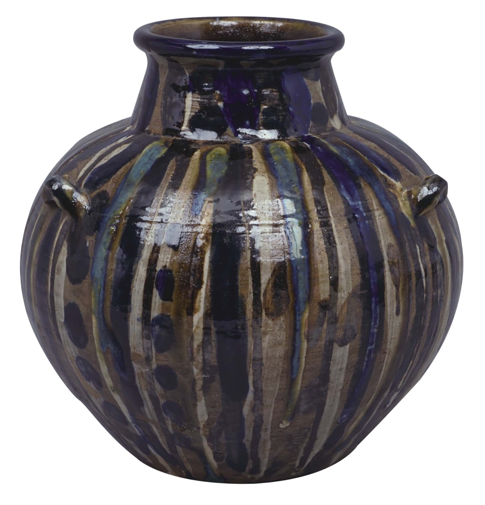 無論是對中國或日本、朝鮮,與各國往來的點滴均沁入藝術品,得以看見文化與技術的交織。由本次來臺的三件國寶為例,〈三彩三耳壺〉(圖5)為沖繩壺屋燒代表作,有綠、青、褐三色釉藥流淌,這種類似中國三彩的技術,為萬曆朝鮮之役(壬辰倭亂,1592-1598)後,薩摩引入朝鮮陶工所帶來的技術。1682年尚貞王時代,琉球各地的窯場統一集中於牧志村南部,即現今那霸市壺屋地區,「壺屋燒」因此得名。