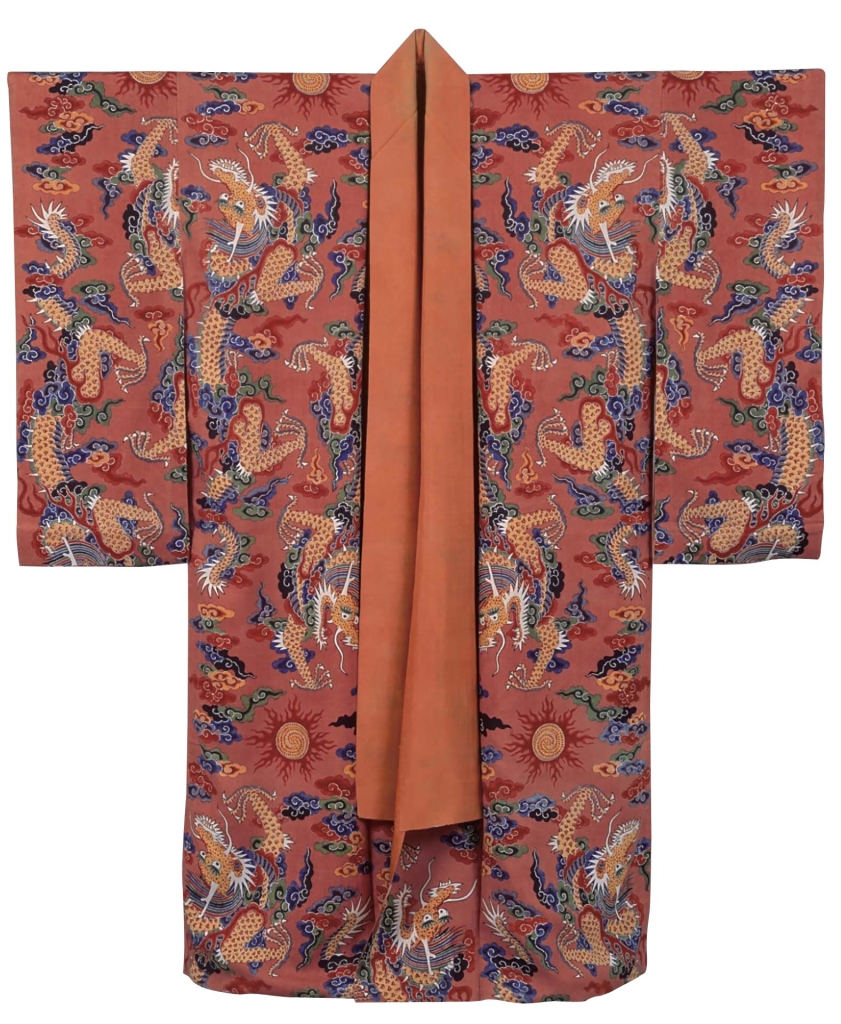 另二件國寶,〈紅地龍寶珠瑞雲紋紅型平絹袷衣〉(圖6)為琉球王子的冬季衣裳,使用了琉球特有的「紅型染」,這種技法融合了中國的紙型技術和京都友禪染,以植物染料製成鮮豔的成品。在紅型染基礎上,裝飾極具中國特色的雲龍寶珠紋,這種寶珠雙龍紋乃近世琉球的王權象徵,其象徵意義可謂與宗主國中國一脈相承。