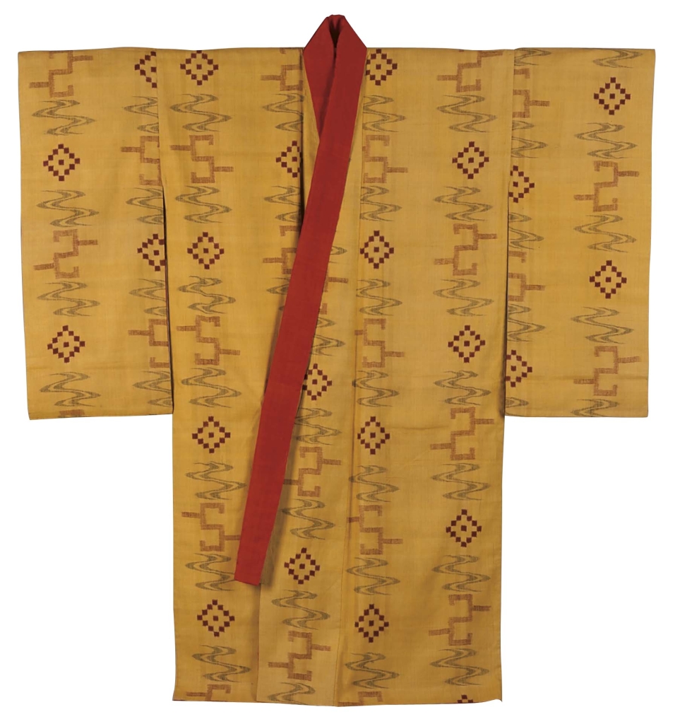 國寶〈黃地流水鑰匙菱繫紋絣織紬衣〉(圖7)為王室冬季絣織衣裝,經由化學分析,發現鮮豔的黃色底色以薑黃染製。薑黃別名「鬱金」,原產於南亞,由中國傳入日本,據說在16世紀進入琉球,琉球緯度較低,比日本更適合栽種薑黃。琉球兩屬時代,薑黃是琉球對外的重要物資,被用於進口薩摩藩和其他日本地區,在江戶與大阪尤受歡迎。除作為藥用,人們認為以薑黃染製的衣服可減少蟲害。〈黃地流水鑰匙菱繫紋絣織紬衣〉上的流水、菱形、鑰匙等絣織紋樣,稱作「御殿柄」,是琉球王國時期貴族和王族專用的織物圖案。