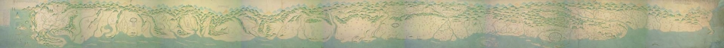談論日治時期以前的長卷畫,以國立臺灣博物館藏〈康熙臺灣輿圖〉(圖1)與國立故宮博物院藏〈乾隆臺灣地圖〉(圖2)等清領時期臺灣輿圖為代表。這些長卷輿圖按照右而左的展開順序,呈現臺灣從南到北西半部平原的海岸、道路、山河、城市景觀,如此安排,對應自海內向海外(臺灣)眺望的觀看視角,反映清帝國對新領地臺灣的掌控程度。除此之外,畫師還會在地圖內描繪人物或動物的圖像,讓輿圖同時多了風俗畫的功能。