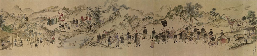 其次案例,是描寫帝國巡視與平埔族原住民生活風俗的長卷畫,如〈林天木臺灣巡視圖〉(圖3)、中國國家博物館藏〈巡視臺陽圖卷〉等,前者描寫巡臺御史林天木於雍正年間奉旨巡視臺灣,一旁是原住民生活的場景,雖說現藏於臺博館的版本是1920年代水彩畫家片瀨弘受託前往廣東臨摹原作後的摹本,但仍反映中國繪畫中「出行圖」的基本樣式。觀者自右而左開闔卷軸,可以循著巡視隊伍。