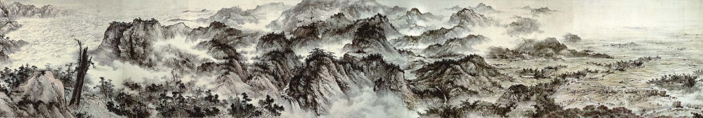 與數十年前木下靜涯〈蕃地繪卷〉相似,〈寶島長春圖卷〉採高空俯瞰視點,將景觀囊括觀者視線內。然而不同的是,此作在製作上強調傳統長卷形式,如自右而左的觀看順序(這點從張大千落款於長卷左側末端可以窺見),但又以極大尺幅奪人眼球,打破卷軸固有的傳統性,這或許呼應了石守謙在〈巨幅─與展覽之視覺當代性〉一文中提及的「八〇年代臺灣的當代現象」。