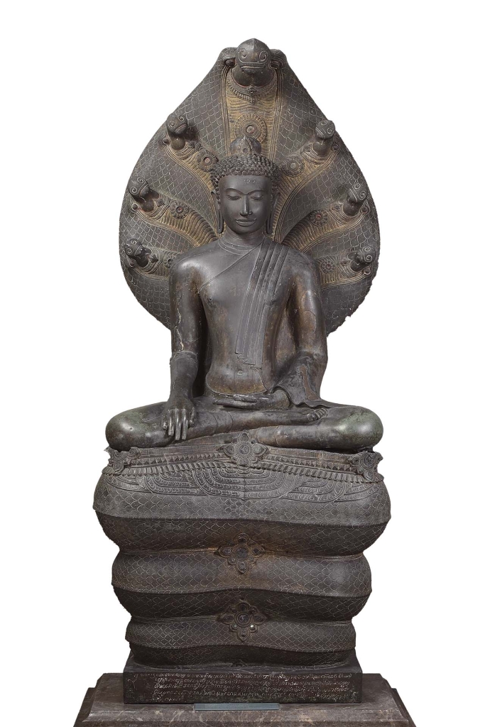 在南亞和東南亞流行著一種特殊的佛陀形象,描繪佛陀坐在一條多頭蛇身上,受到蛇頭罩頂的保護。在南傳佛教的背景脈絡下,這種形象表現的故事眾所皆知:佛陀於菩提樹下打坐,其樹根即為目支鄰陀(Mucalinda)的棲息處。當遭逢七日七夜的暴雨時,目支鄰陀自棲息處竄出;以自身纏繞佛陀七圈,並以七個頭為佛陀遮擋雨勢。在柬埔寨和泰國部分地區,這類佛像通常以銅製成,是當地最顯赫的佛像,我們有理由相信此造型之所以受到歡迎與水的重要性有關。展覽所選的範例是一件來自泰國的〈佛坐像〉(圖9),年代為12至13世紀。這件非凡的作品是從曼谷國立博物館借出的特別藏品,也是其在海外之首次展出。