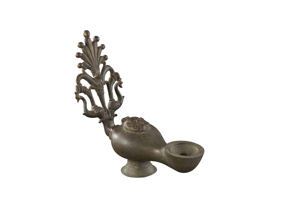 青銅器也應用在油燈的創造上,本展中的一件公元5至6世紀製作於地中海周圍,可能是在埃及的亞歷山卓(Alexandria)製造並出口到泰國的青銅燈(圖13),燈的表面裝飾著羅馬釀酒和醉酒之神西勒努斯(Silenus)的頭像,這是青銅物件在地中海世界與亞洲之間的移動的罕見案例,顯示了青銅工藝的深遠影響。在亞洲,亦存在豐富的青銅燈傳統,其造型靈感來自鳥類、動物和神話生物。