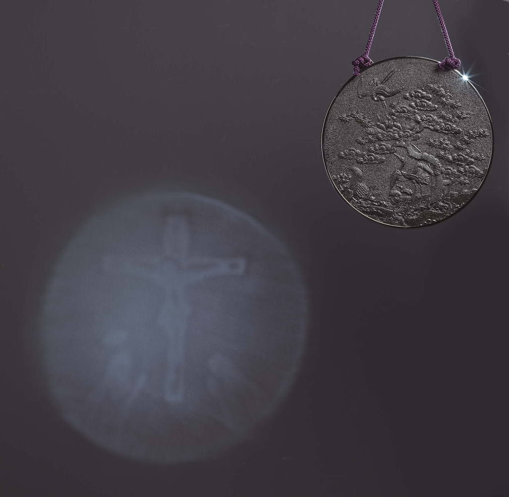 自公元前三千年起,青銅的反光特性使其成為鏡子的理想材料。在東亞,一種被西方稱為「魔鏡」的獨特類型被開發出來,這種「魔鏡」最早在中國的漢代就已經出現,在後世被稱為「透光鏡」。這種鏡子能夠反射出其背面裝飾的圖像,營造出光線穿透金屬的錯覺,但實際上卻是折射的。當光束折射時,無論投射的光束落在哪裡,都可以看到鏡面後的圖案。這種效果是鏡面拋光技術所造成的假象,拋光之後的鏡面會產生肉眼無法察覺的不規則凹凸,與背面的凸起圖案相對應。這種鏡子的生產方法在中國自宋代以後就失傳了,不過中國的「透光鏡」卻傳到了日本,到了江戶時代,日本工匠開發了一種技術,能夠將圖像隱藏在鏡子中,因此投射出來的圖像與背面的裝飾不同。在基督教被禁止的時代,日本工匠製作了能夠投射出十字架和聖母瑪利亞影像的「魔鏡」,並在基督徒之間祕密流傳。「魔鏡」的製作技術在日本保存至今,來自京都的山本合金製金所的山本晃久(1975-)是其家族第五代的製鏡師,致力於保存並改良和鏡的製作工藝,荷蘭國家博物館特別訂製了兩件由他所鑄造的「魔鏡」(圖 14)。