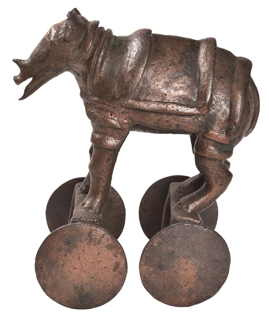 同時,此時期印度河流域的工匠就已經能夠將多個各別鑄件組裝在一起,創造出了更複雜的文物。在印度馬哈拉施特拉邦(Maharashtra)代馬巴德(Daimabad)發現的一尊犀牛雕像就證明了這一點(圖2):犀牛的前後腳各自站立在一個平臺上,平臺上組裝有輪子,這尊犀牛也是印度河流域文明中少數已知的青銅雕像之一。印度河文明屬於南亞文明,大約在公元前2500年至公元前1500年蓬勃發展。在原始歷史時期,印度許多地區都存在犀牛,現在牠們幾乎滅絕了。犀牛的某些部分,例如角和血,被認為具有神奇和藥用特性。
