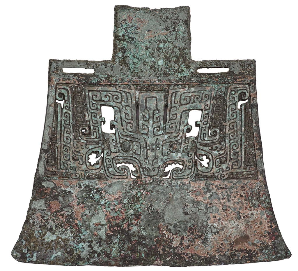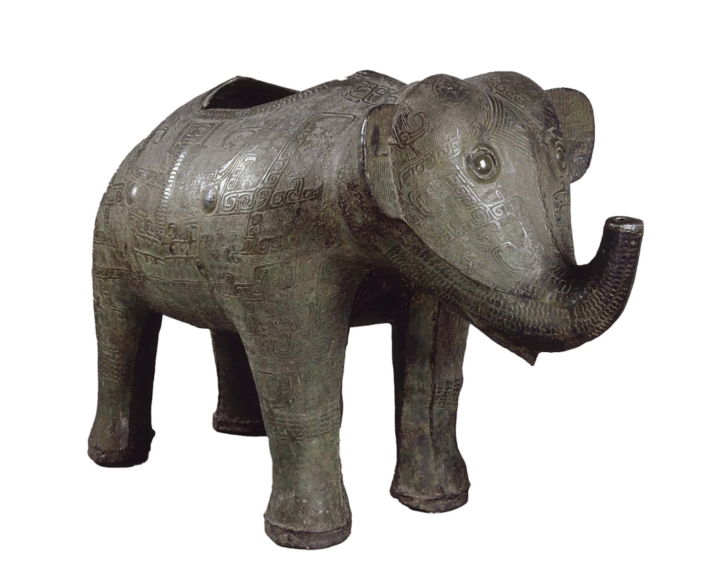 展出的一件中國商代的斧刃(或稱「鉞」,公元前 13 世紀,圖3)是用雙合範製成的。成品上的饕餮紋包括凸起的陽紋和低陷的陰紋以及鏤空,這些鏤空是模具壁間的凸起物阻擋熔融金屬流動的所形成的。斧刃上大多數的鏤空是裝飾性的,但靠近頂部的兩條孔隙是功能性的,用來將斧刃綁在木柄上。這件青銅斧的前身是用石頭或玉石製成的,上面鑽有功能性的孔。然而,當媒材改為青銅,在鑄造後很難在厚重的青銅上切割又長又窄的孔,因此這把青銅斧的孔隙很可能是鑄造的。塊範法鑄造出現於中國中部河南和山西的二里頭文化(公元前1900-1500)。上古中國工匠在青銅鑄造方法的選擇上與其他亞洲文化有顯著的差異:複雜的黏土塊範可拆卸,並在內部進行裝飾。展出的這件精美的大型象尊孤品需要多組塊範模件才能完成(圖4)。