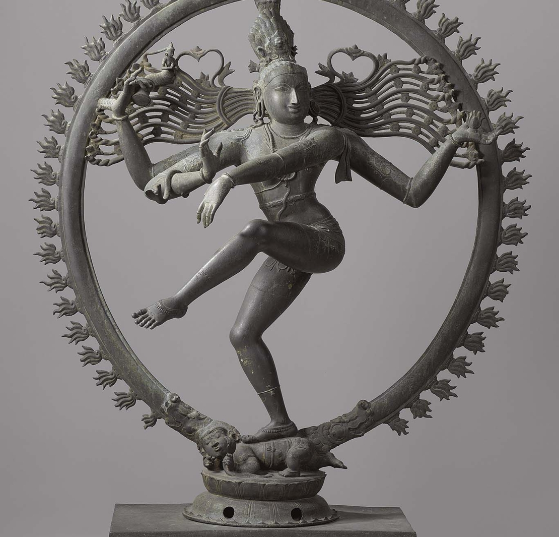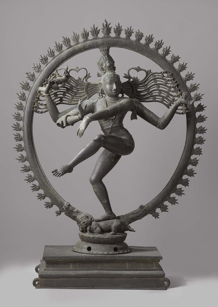 該技術在鑄造巨大且複雜的形體方面是獨一無二的,例如荷蘭國家博物館所收藏的高1.5公尺、重約300公斤的〈濕婆.納塔羅闍〉(Shiva Nataraja,約公元1100-1200,圖5)。雖然基座的兩個部分是分開鑄造,之後再連接在一起,但最大的神像部分,也就是由伸展六肢(四手兩腳)的神祇及環繞於其背後的火焰光環,卻是一體成形鑄造,精湛的工藝令人難以置信。將這麼多的金屬鑄成這樣的造形,是很難甚至不可能用其他方法達到的。例如在歐洲的失蠟法鑄造中,雕像往往是倒鑄的,只有一個澆口。觀察南印度當代的作法,並與其他實心青銅器進行比較,可知濕婆像的背部有多個澆口,而且鑄造時是面朝下的,這樣的方式可確保金屬能夠快速澆注,而且金屬融液不需要在模具內流動太遠。濕婆頭部背後的飾物很可能就是澆口或其他的豎管,這些豎管在鑄造後並未全部被移除,而是被用來當作裝飾;其他的澆口也保留在原處,在蠟模階段就已經裝飾好了。展覽聚焦獨特的製作方法,旨在強調這些技術在特定亞洲地區發展的地方化專業知識和精湛技藝。這也證明了豐富多樣的工藝技術,塑造了整個亞洲青銅作品的複雜世界。
