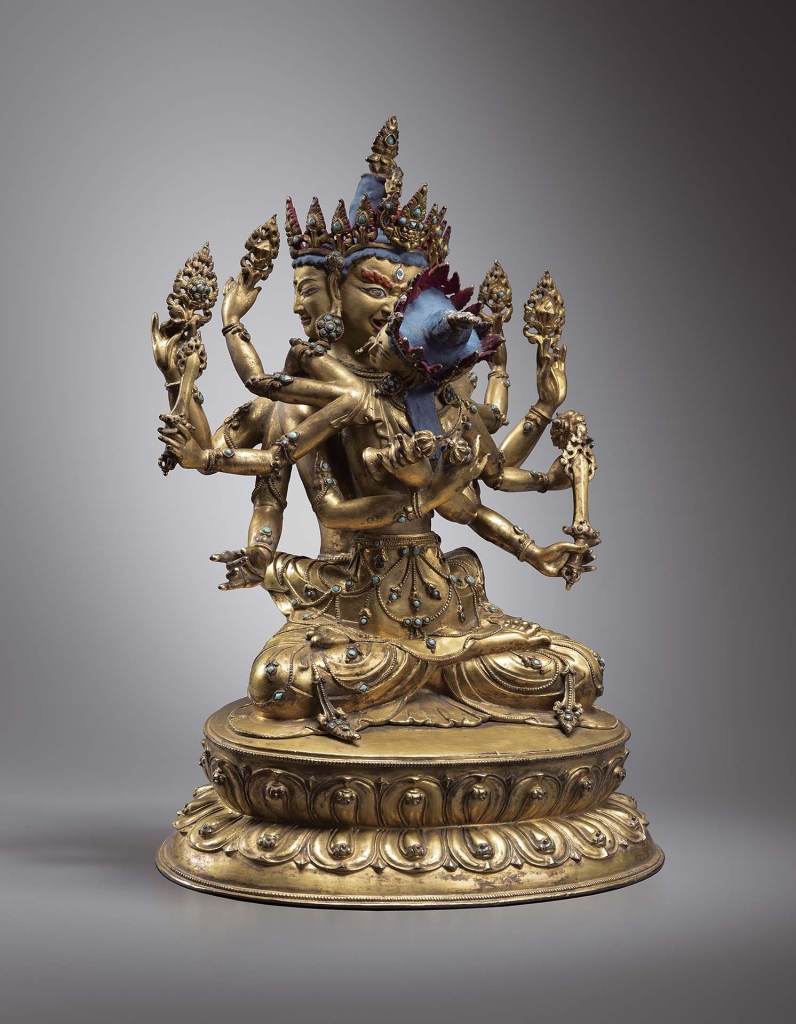 另外,荷蘭國家博物館新購藏的一尊西藏15世紀的〈密集金剛〉(圖8)表現其與明妃的親密擁抱。三面六臂,三面分別示現慈悲、息災和降魔之功德;每面三目,代表觀照過去、現在、未來;頭戴五葉冠,象徵五佛或五菩薩,頂飾是阿閦佛。六隻手臂各持法物,前二臂抱金剛佛母,持金剛鈴、金剛杵,象徵智慧與方便成就;居上右手持法輪、象徵法輪常轉;居下右手拿蓮花,象徵智慧清淨;居上左手持寶珠,象徵所求如願;居下左手握寶劍,象徵斬斷一切無明。該雕像由銅鑄造,隨後鍍金。其風格受到永樂時期宮廷漢藏金銅佛作品的影響。