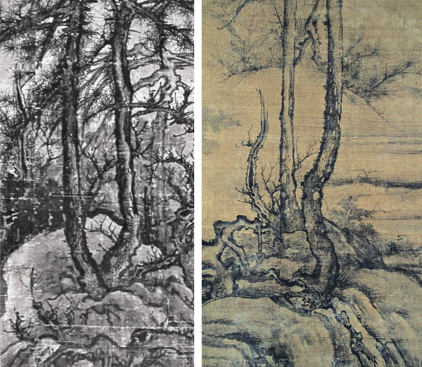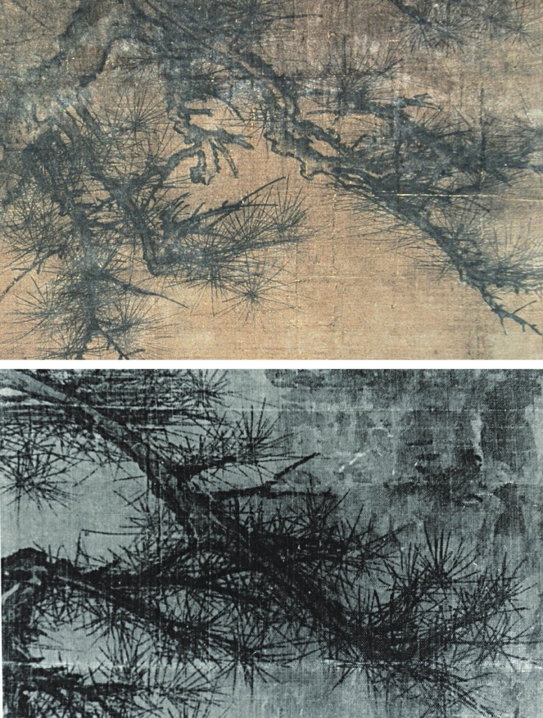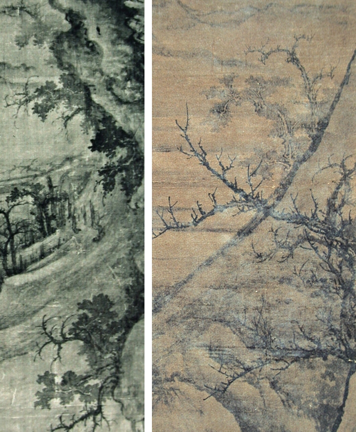 筆者的觀察是:〈早春圖〉是一幅完整的構圖,是雙拼絹,接縫在中央。然而此幅從圖片上看是三拼絹,接縫不在中央,其左幅拼絹痕約略順著左方松幹的外廓,故絹幅極為狹窄,較之中間一幅尚不及半,此其一。又左邊幅的中央,在枯樹的左方,有淡墨點葉的樹枝伸向右方。再往上方看,又有淡墨松枝斜伸入右方主松濃枝的後方。如此看來,左方似尚有畫面被裁切?至於畫幅右方,從絹幅寬度及斜伸自畫幅邊緣的枯枝來看,也有不太嚴重的少許裁切?