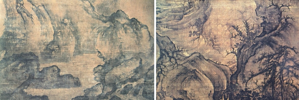 以上第1、2兩幅的畫法都是輪廓與皴筆分明獨立,再以渲染呈其立體和陰陽前後,與〈讀碑窠石圖〉及〈喬松平遠圖〉中連皴帶染顯著不同,這可能是李成與郭熙在筆墨技法上,因時間相隔近一個世紀,不同時代的風格差異。