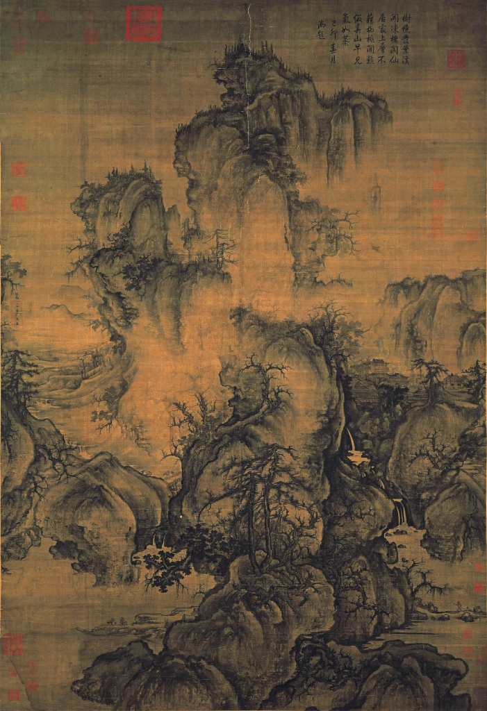 而在李成名下的作品中,個人最喜愛的並不是平遠的章法,而是美國納爾遜美術館的〈晴巒蕭寺圖〉軸,不論是筆墨皴法、界畫、人物等等,均是一流,而且可以認定這是郭熙之前的作品。但是能否早於范寬的〈谿山行旅圖〉?以及如何肯定是李成?則只有見仁見智,恐怕是永無定論的了。