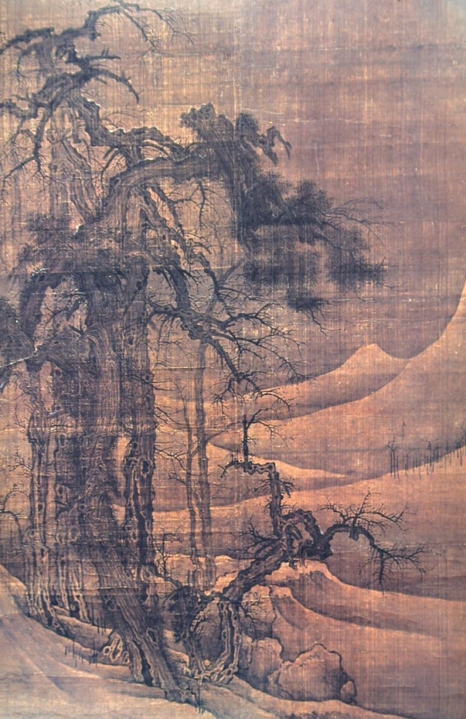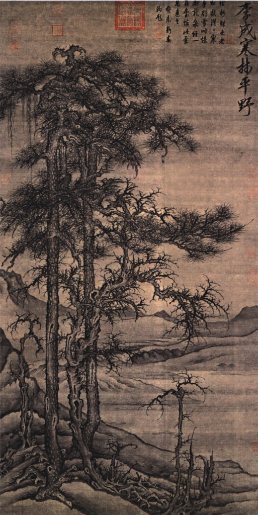 2、傳郭熙〈寒林圖〉軸,台北故宮博物院藏。此圖章法與傳李成〈寒林平野圖〉相近,只是將左半幅的主松改成古柏,且枯木增多,筆墨也稱自然。皴染分明並無郭熙的特點,當是屬於郭熙之前的畫法,與〈喬松平遠圖〉非一家眷屬,可能更近於李成的畫風?