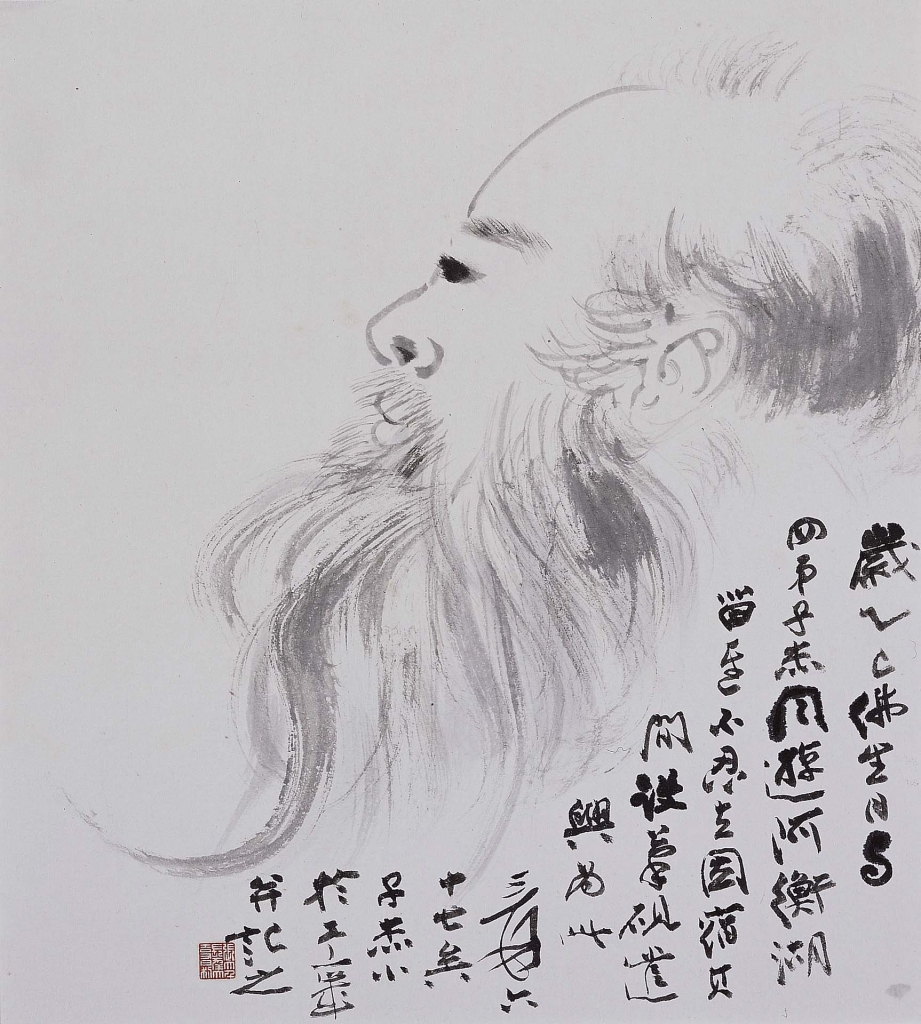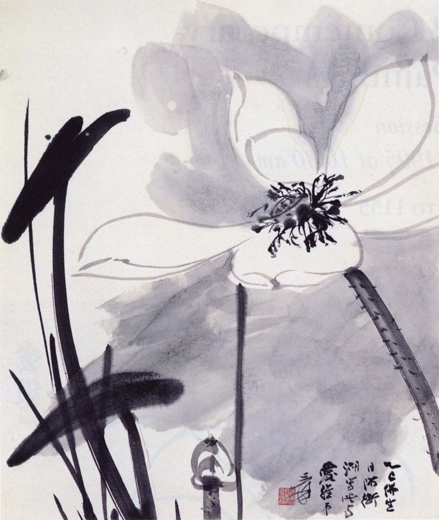 1965年,大千先生由瑞士入奧地利,遍覽阿爾卑斯山各處景色,因而畫興大發,旅程之後留下一系列「瑞奧道中」的潑墨潑彩系列名畫。此行實有深入奧地利中部的愛痕湖一遊。並且特地為郭有守與李愛維繪製兩幅尺寸約略相似的對畫:〈自畫像〉與〈白荷〉(圖8)。因此可確認在「佛生日」這天(佛誕:農曆四月初八,1965年6月8日),張大千與郭、李二人正旅宿於愛痕湖邊。如此也呼應傅維新的紀錄:此年張大千遊覽瑞奧二國,實為郭有守陪同,並由長居瑞士的李愛維擔任導遊,善盡地主之誼。郭氏且有意情商大千先生將其愛好丹青的女伴收為大風堂門下弟子,最終也獲得先生首肯。從贈李愛維的〈白荷〉款識中已稱之為「愛維弟」,可知此時已收為弟子。由此事亦可知郭、李二人情感已深,大千先生亦笑然面對自己好友的這一段暮年情事了。