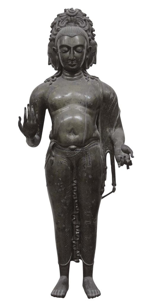 其中,來自巴基斯坦約6至7世紀的黃銅梵天像是一件精美絕倫的傑作。作為印度教中最重要的神靈之一,梵天是宇宙的創造者,然而祂的金屬雕像卻非常罕見。與印度東南部朱羅王朝(10至13世紀)的青銅雕像通常由單次實心澆鑄的製作方式不同,這件雕塑是單次空心鑄造的。由這件雕像近一公尺高的尺寸、製作年代,以及細緻精湛的鑄造工藝─如頭髮的處理與衣紋表面的金屬鑲嵌,都顯示這件作品極高的藝術價值。