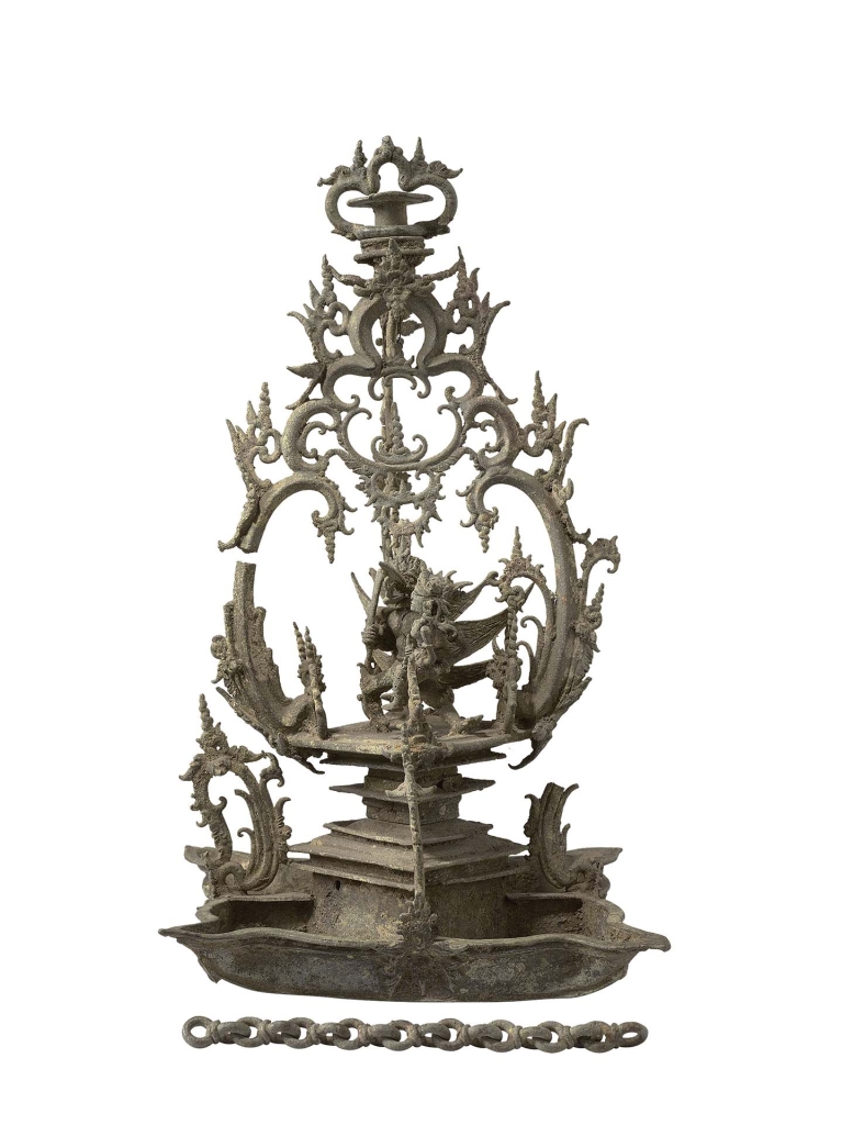 長期以來,火一直與創造和毀滅聯繫在一起,並在世界各地的宗教活動中發揮重要作用。與火或光有關的物件是人類所製作最古老的文物之一,如青銅油燈因其反光的表面而備受珍視,它們曾經照亮寺廟、宮殿和居家。此部分展示的是與視覺相聯繫的燈具以及能夠映照影像的銅鏡。展出的燈具包含印度、印尼的經典作品,例如一件出自寺廟,紀年1863年,裝飾繁複的印度大型拱形油燈(276.8×200.7×7.6公分)賦予觀者華麗的視覺想像。此外,一件羅馬時代地中海沿岸鑄造的青銅燈竟自泰國出土,述說著一段路途遙遠的旅程故事。另一件來自印尼東爪哇約14至15世紀的懸掛式油燈,有著複雜多變的形狀和裝飾,燈上鑄有一隻金翅鳥(Garuḍa),也許這盞燈曾經掛在一座印度教的寺廟裡頭。這盞燈有著四個油室,每個部分都能投射各自的陰影,創造出趨近於3D的立體投影效果。
