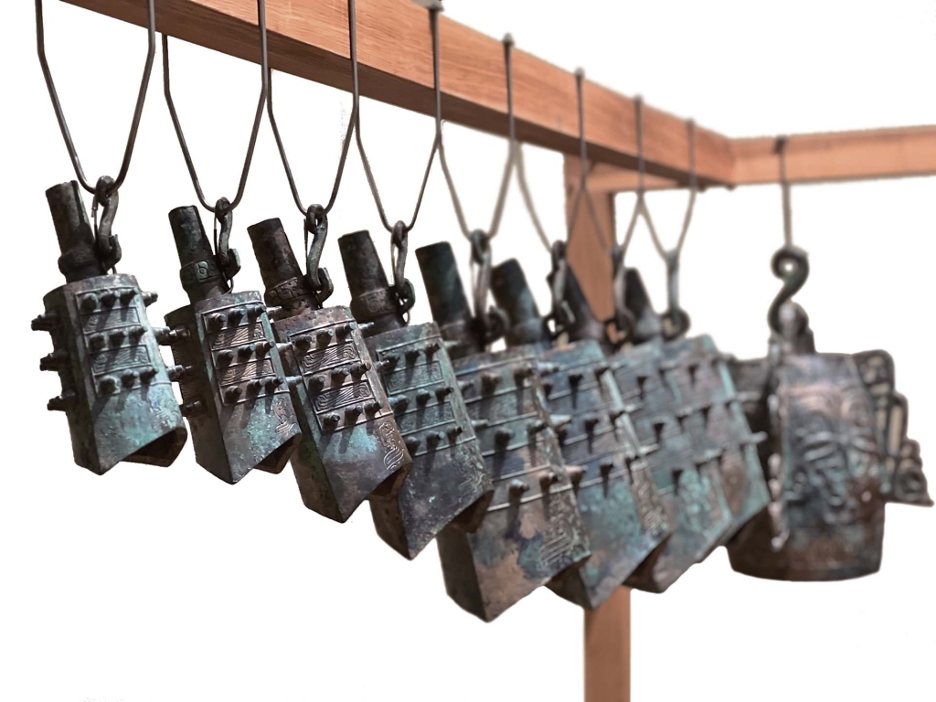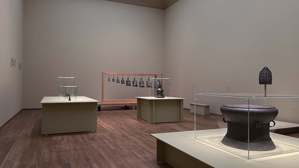 青銅非常適合產生聲音,無論是信號還是音樂。本展間展示的是與聽覺有關的青銅樂器。包括來自中國西周約公元前8世紀的編鐘、日本彌生時代2至3世紀的銅鐸、越南東山文化約公元前4世紀的銅鼓,以及印尼爪哇約9到10世紀的銅鐘等等。經由先進的青銅加工製作技術,這些樂器可以呈現出各種繁複的形式。工匠們用精緻的圖案裝飾這些物件,將它們昇華為藝術品。這些鐘和鼓,有的在尺寸上大得令人印象深刻,有的則可以產生多種音調,得以作為樂器使用。展出的一套周代編鐘,由八個斜懸的甬鐘和一個直懸的鏄鐘所組成,這類編鐘在鑄造上已經相當困難,更困難的是在鑄造後確保個別的鐘發出準確的音調,編鐘內的不規則痕跡,即是工匠鑄造後修正調音的痕跡,可謂是當時的「超前黑科技」!當敲擊在特定位置,每個甬鐘能發出一個半音和一個全音。