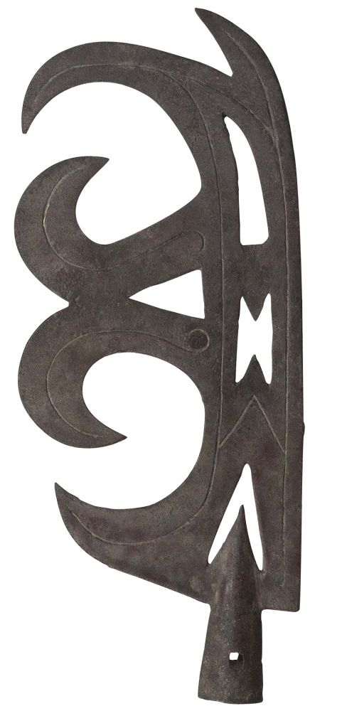 青銅武器、工具的製造和使用遠遠早於鐵製品,由於這種材料適合頻繁和長期地使用,以此製造的武器與工具在青銅時代是最常見的器具。青銅很容易成型,硬度高,可以磨出銳利的刃。長期以來,戰爭的勝敗在很大程度上取決於一支軍隊所擁有的青銅武器的數量,然而,實用性並非青銅武器製作時唯一考慮因素:青銅武器常常呈現出壯觀的形式,很多時候成為顯示其所有者身分地位的象徵物。第九展間展示的是與觸覺有關的青銅武器,以大方桌獨立展示一件中國西周的儀式用武器,以呼應第一展間的設計。這件造型類似戟的武器非常罕見,就筆者所知僅共有兩件存世,另一件現存紐約大都會博物館,應該與這件同屬一對。