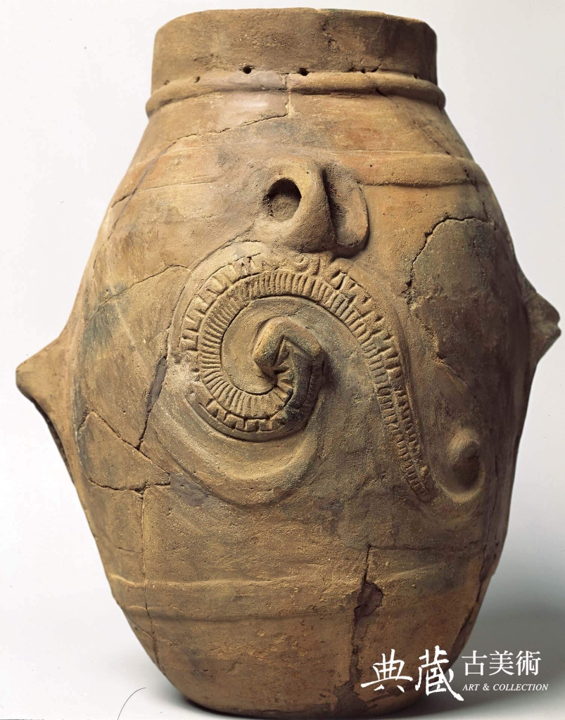 在本單元中,我們將展出考古遺物中表現蛇的作品。繩文時代中期製作的〈開孔帶圈陶器〉(出土地不明),「開孔」指器皿上緣周圍的孔洞,「圈帶」指器皿中段部分的凸起造型或裝飾。