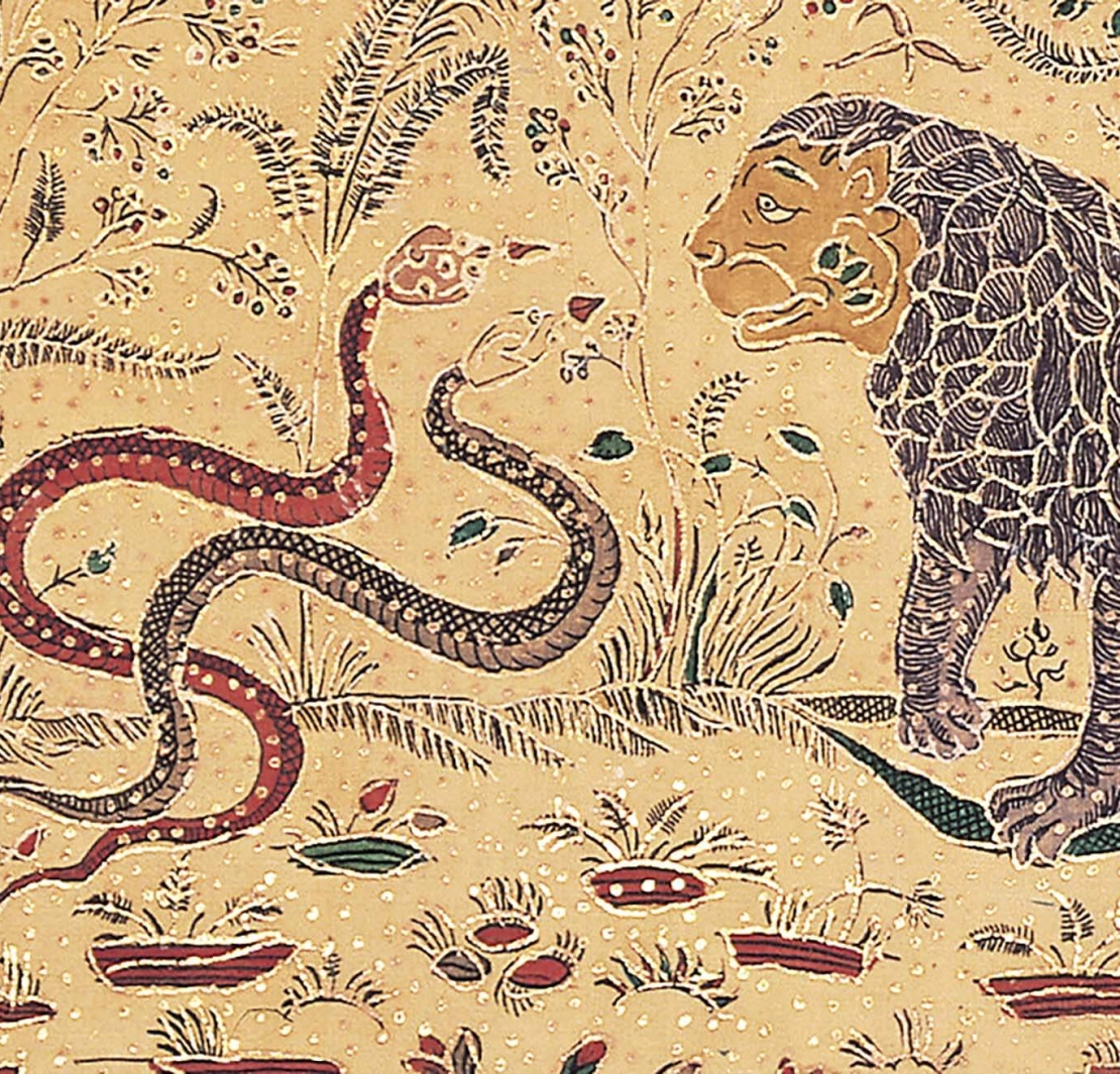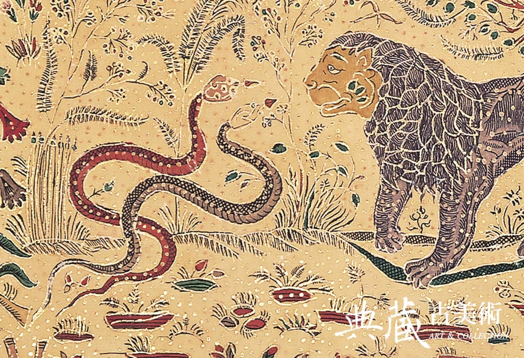 在日本江戶時代,有花紋的染布(被稱為「更紗」)從印度或爪哇等地進口,受到人們珍視(註4)。特別是施以金箔或金泥裝飾的布料,被稱為「金華布」或「金更紗」。這件〈草花獅子蛇紋金華布〉是17世紀於印度製作的布料裂片,傳自加賀藩的前田家,是第三代藩主前田利常派遣家臣前往長崎購得的裂片之一。布料上描繪著獅子與眼鏡蛇,四周開滿各種花卉,鮮豔的紅色與金色交織成一件極為美麗的作品(註5)。