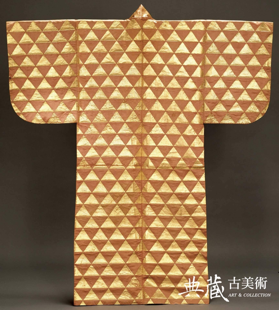 江戶時代(19世紀)製作的〈能劇裝束 淡紅地鱗紋摺箔〉在淡紅色的布料上,排列著連續的三角形「鱗紋樣」。金色部分採用的是摺箔技法,將切割出花紋的模紙放到布料上,塗上糨糊,再貼上金箔或銀箔。鱗紋樣據說是模仿蛇的鱗片,在能劇中,演員表演被嫉妒與怨恨所控制的女性角色時,會穿著這種裝束。例如在《道成寺》中,一名因戀愛執念太深而化為大蛇的女子,將藏在梵鐘中的對象以火焰焚燒殆盡。這名女子的執念,便是透過般若面具與鱗紋樣的服裝來表現(註6)。