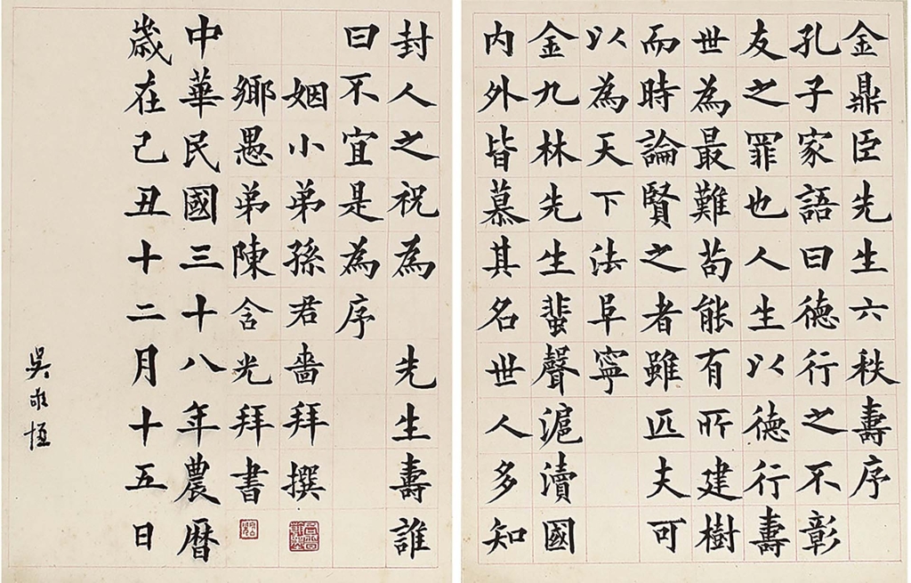 陳含光為揚州宿儒,且有前清功名,來臺之後深為政界文壇所重,曾多次為國民政府要員的重要場合書寫序文。如《金鼎臣六十壽序》(1949,圖11,註1)、《陳勤士八秩壽言》(1950)、《贈周至柔惜別序》(1952)等,皆敦請陳含光領銜作書,黨國要員、社會賢達簽名於後。連隨政府來臺的中國石油公司,亦敦請陳含光題榜「中國石油」(圖12),皆可證明當時陳含光為臺灣社會與黨政人士共所推崇的賢達耆碩。