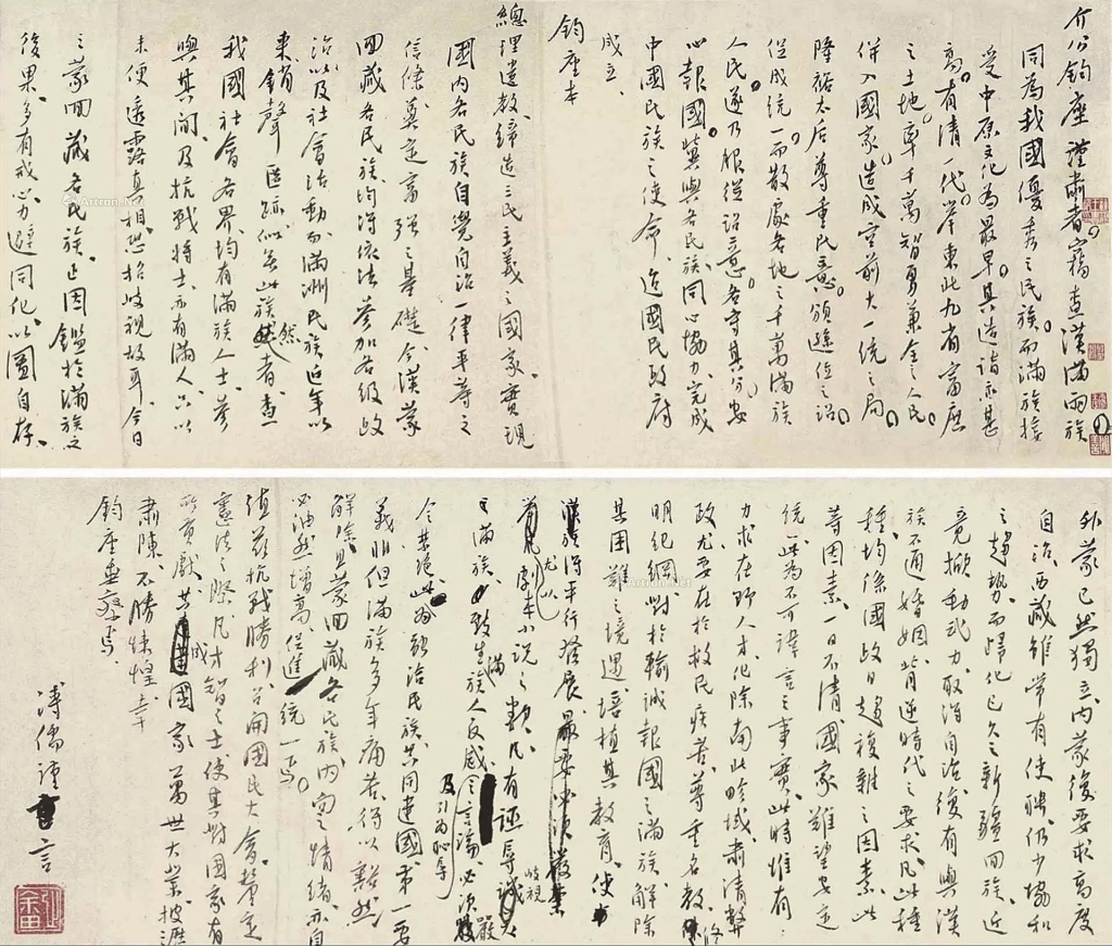 接著,對日抗戰期間堅拒滿州國與日本的拉攏,使其在抗戰結束後,得以滿族代表身分參與制定中華民國憲法。期間更多次直接上書蔣中正(圖15,註2),希望為深受社會歧視的滿族正名並爭取參議權。溥心畬的訴求也獲得蔣中正的正面回應,不僅順利在北平成立「滿族文化協進會」、增加滿族國大代表之名額,他也於1948年順利當選第一屆國大代表。