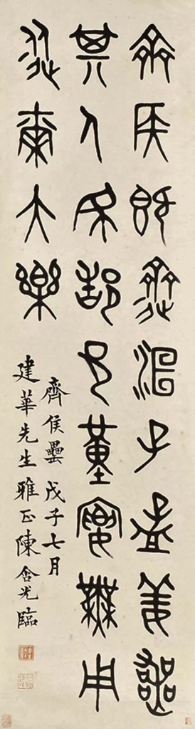 陳含光融會金文入小篆的作法,其實導源於晚清吳大澂。陳含光曾表達過他對吳大澂的服膺之意:「王錢孫洪以上為舊體,鄧吳以降為新體,而於晚出之吳愙齋最為服膺。謂愙齋以鍾鼎籀法納入小篆之中,樸厚無倫,當時無兩,其尊之幾欲居石如之上」。吳大澂始終以〈石鼓文〉的史籀筆法融會金文與小篆,故能「樸厚無倫」,黃士陵即是承此一路。陳含光別出心裁,將金文中獨特的尖筆特徵強化發揮,既呼應了傳統篆史上如〈天發神讖碑〉、〈詛楚文〉、唐代〈浯臺銘〉等少數的尖筆篆書,也在晚清至民國蓬勃發展、名家輩出的金石書法中,建立起獨樹一格的個人面貌。