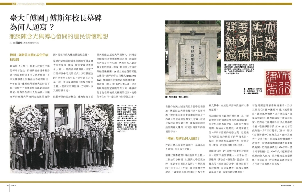 (本文出自《典藏.古美術》389期〈臺大「傅園」傅斯年校長墓碑為何人題寫? 兼談陳含光與溥心畬間的遺民情懷雜想〉,作者:羅啟倫。)