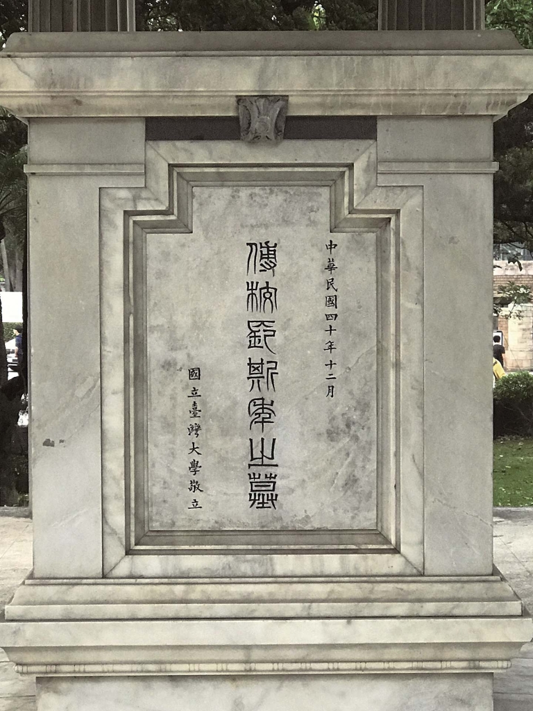 墓碑以篆書題寫「傅校長斯年之墓」,二側並用小楷書,以臺灣大學名義立碑,並誌年月而已(右排:中華民國四十年十二月。左排:國立臺灣大學敬立),書家並未署款(圖2)。校史相關文獻中,亦無記錄當時敦請何人書寫墓碑。